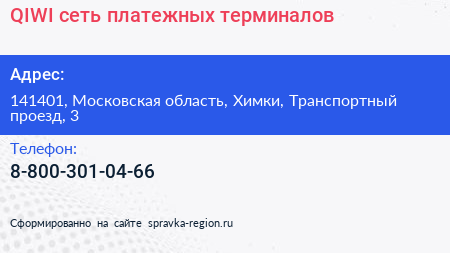 QIWI, сеть платежных терминалов по адресу 141401, Московская область, Химки, Транспортный проезд, 3 в дальнейшем Организация, размещена в следующих категориях:
