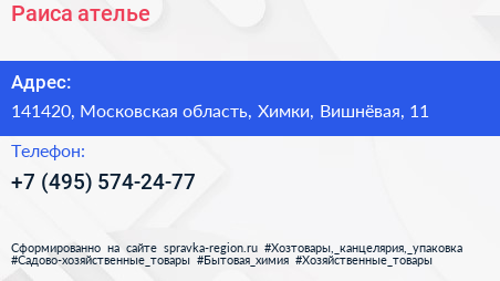 Раиса, ателье по адресу 141420, Московская область, Химки, Вишнёвая, 11 в дальнейшем Организация, размещена в следующих категориях:
