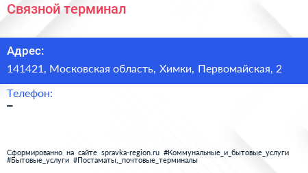 Связной, терминал по адресу 141421, Московская область, Химки, Первомайская, 2 в дальнейшем Организация, размещена в следующих категориях: