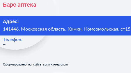 Барс, аптека по адресу 141446, Московская область, Химки, Комсомольская, ст15 в дальнейшем Организация, размещена в следующих категориях: