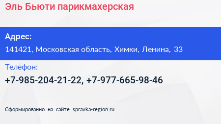 Эль Бьюти, парикмахерская по адресу 141421, Московская область, Химки, Ленина, 33 в дальнейшем Организация, размещена в следующих категориях: