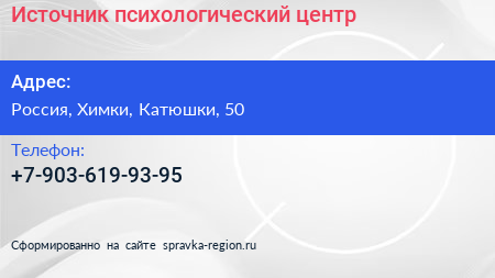 Источник, психологический центр по адресу Психологический центр развития личности "Источник", 50, улица Катюшки, Москвич, Катюшки, Лобня, Московская область, Центральный федеральный округ, 141736, Россия в дальнейшем Организация, размещена в следующих категориях: