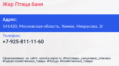 Жар Птица, баня по адресу 141420, Московская область, Химки, Некрасова, 2г в дальнейшем Организация, размещена в следующих категориях:
