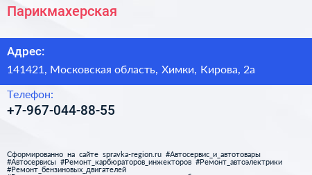 Парикмахерская по адресу 141421, Московская область, Химки, Кирова, 2а в дальнейшем Организация, размещена в следующих категориях: