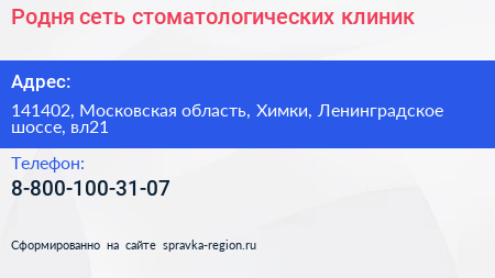 Родня, сеть стоматологических клиник по адресу 141402, Московская область, Химки, Ленинградское шоссе, вл21 в дальнейшем Организация, размещена в следующих категориях: