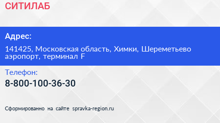 СИТИЛАБ по адресу 141425, Московская область, Химки, Шереметьево аэропорт, терминал F в дальнейшем Организация, размещена в следующих категориях:
