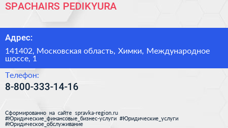 SPACHAIRS-PEDIKYURA по адресу 141402, Московская область, Химки, Международное шоссе, 1 в дальнейшем Организация, размещена в следующих категориях: