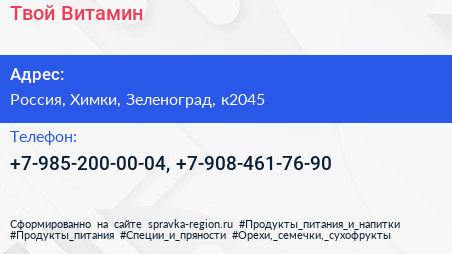 Твой Витамин по адресу Ледовый центр «Платинум», к2045, Георгиевский проспект, Деревня Каменка, 20-й микрорайон, район Крюково, Зеленоград, Москва, Центральный федеральный округ, 124681, Россия в дальнейшем Организация, размещена в следующих категориях: