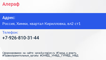 Алераф по адресу ТЦ Ленинградка, 2, Ленинградское шоссе, Черкизово, Молжаниновский район, Новоподрезково, Химки, городской округ Химки, Московская область, Центральный федеральный округ, 141436, Россия в дальнейшем Организация, размещена в следующих категориях: