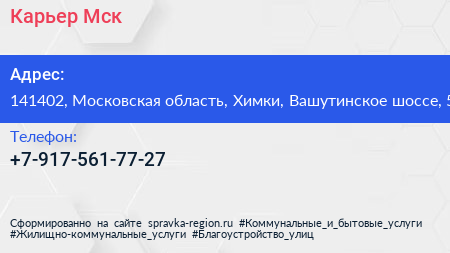 Карьер-Мск по адресу 141402, Московская область, Химки, Вашутинское шоссе, 5 в дальнейшем Организация, размещена в следующих категориях: