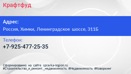 Крафтфуд по адресу 311Б, Ленинградское шоссе, Черкизово, Молжаниновский район, Новоподрезково, Москва, городской округ Химки, Москва, Центральный федеральный округ, 141436, Россия в дальнейшем Организация, размещена в следующих категориях: