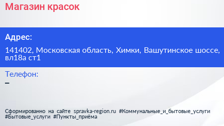 Магазин красок по адресу 141402, Московская область, Химки, Вашутинское шоссе, вл18а ст1 в дальнейшем Организация, размещена в следующих категориях: