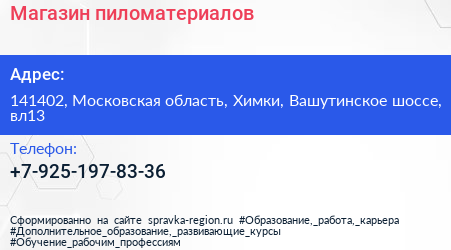 Магазин пиломатериалов по адресу 141402, Московская область, Химки, Вашутинское шоссе, вл13 в дальнейшем Организация, размещена в следующих категориях: