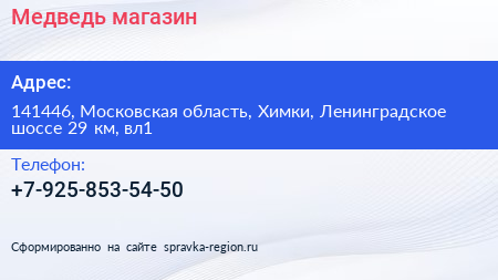 Медведь, магазин по адресу 141446, Московская область, Химки, Ленинградское шоссе 29 км, вл1 в дальнейшем Организация, размещена в следующих категориях: