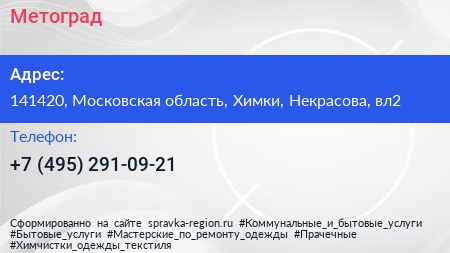 Метоград по адресу 141420, Московская область, Химки, Некрасова, вл2 в дальнейшем Организация, размещена в следующих категориях: