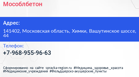 Мособлбетон по адресу 141402, Московская область, Химки, Вашутинское шоссе, 44 в дальнейшем Организация, размещена в следующих категориях: