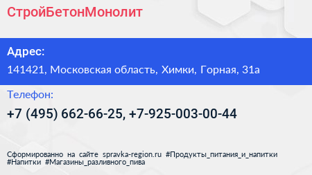 СтройБетонМонолит по адресу 141421, Московская область, Химки, Горная, 31а в дальнейшем Организация, размещена в следующих категориях:
