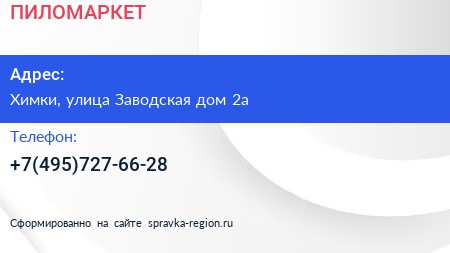 ПИЛОМАРКЕТ по адресу Химки, улица Заводская дом 2а в дальнейшем Организация, размещена в следующих категориях: