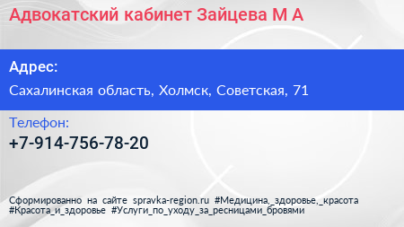 Адвокатский кабинет Зайцева М.А. по адресу Сахалинская область, Холмск, Советская, 71 в дальнейшем Организация, размещена в следующих категориях: