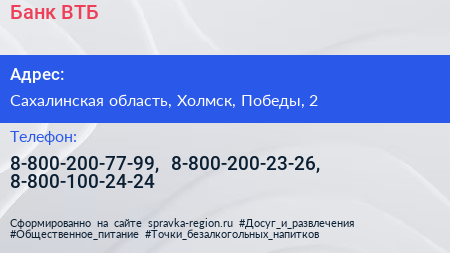 Банк ВТБ по адресу Сахалинская область, Холмск, Победы, 2 в дальнейшем Организация, размещена в следующих категориях: