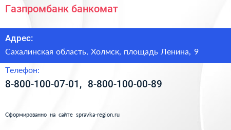 Газпромбанк, банкомат по адресу Сахалинская область, Холмск, площадь Ленина, 9 в дальнейшем Организация, размещена в следующих категориях: