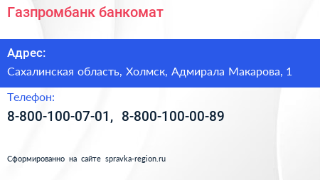 Газпромбанк, банкомат по адресу Сахалинская область, Холмск, Адмирала Макарова, 1 в дальнейшем Организация, размещена в следующих категориях: