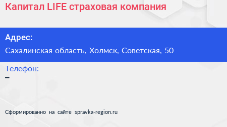 Капитал LIFE, страховая компания по адресу Сахалинская область, Холмск, Советская, 50 в дальнейшем Организация, размещена в следующих категориях: