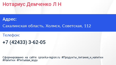 Нотариус Демченко Л.Н. по адресу Сахалинская область, Холмск, Советская, 112 в дальнейшем Организация, размещена в следующих категориях: