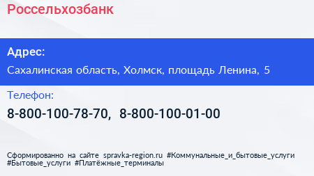 Россельхозбанк по адресу Сахалинская область, Холмск, площадь Ленина, 5 в дальнейшем Организация, размещена в следующих категориях: