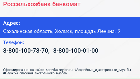 Россельхозбанк, банкомат по адресу Сахалинская область, Холмск, площадь Ленина, 9 в дальнейшем Организация, размещена в следующих категориях: