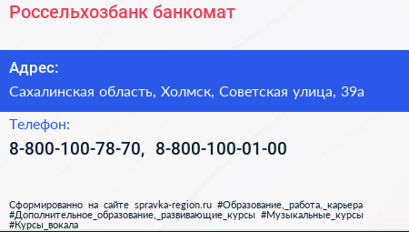 Россельхозбанк, банкомат по адресу Сахалинская область, Холмск, Советская улица, 39а в дальнейшем Организация, размещена в следующих категориях: