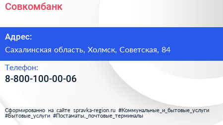 Совкомбанк по адресу Сахалинская область, Холмск, Советская, 84 в дальнейшем Организация, размещена в следующих категориях: