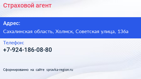 Страховой агент по адресу Сахалинская область, Холмск, Советская улица, 136а в дальнейшем Организация, размещена в следующих категориях: