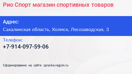 Рио-Спорт, магазин спортивных товаров по адресу Сахалинская область, Холмск, Лесозаводская, 3 в дальнейшем Организация, размещена в следующих категориях: