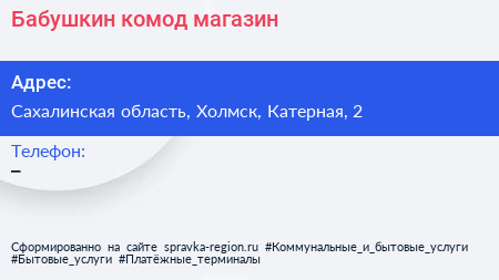 Бабушкин комод, магазин по адресу Сахалинская область, Холмск, Катерная, 2 в дальнейшем Организация, размещена в следующих категориях: