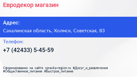 Евродекор, магазин по адресу Сахалинская область, Холмск, Советская, 83 в дальнейшем Организация, размещена в следующих категориях: