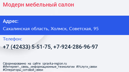 Модерн, мебельный салон по адресу Сахалинская область, Холмск, Советская, 95 в дальнейшем Организация, размещена в следующих категориях:
