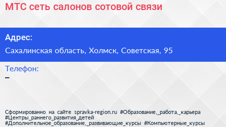 МТС, сеть салонов сотовой связи по адресу Сахалинская область, Холмск, Советская, 95 в дальнейшем Организация, размещена в следующих категориях: