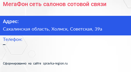 МегаФон, сеть салонов сотовой связи по адресу Сахалинская область, Холмск, Советская, 39а в дальнейшем Организация, размещена в следующих категориях: