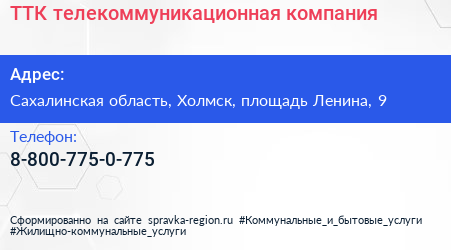 ТТК, телекоммуникационная компания по адресу Сахалинская область, Холмск, площадь Ленина, 9 в дальнейшем Организация, размещена в следующих категориях: