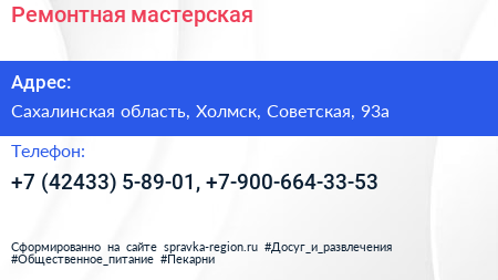 Ремонтная мастерская по адресу Сахалинская область, Холмск, Советская, 93а в дальнейшем Организация, размещена в следующих категориях: