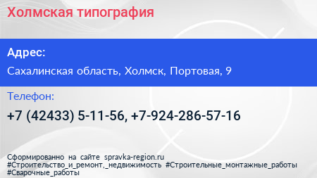 Холмская типография по адресу Сахалинская область, Холмск, Портовая, 9 в дальнейшем Организация, размещена в следующих категориях: