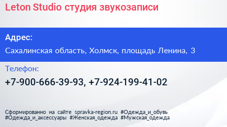 Leton Studio, студия звукозаписи по адресу Сахалинская область, Холмск, площадь Ленина, 3 в дальнейшем Организация, размещена в следующих категориях: