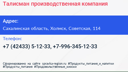 Талисман, производственная компания по адресу Сахалинская область, Холмск, Советская, 114 в дальнейшем Организация, размещена в следующих категориях: