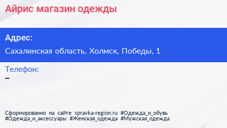 Айрис, магазин одежды по адресу Сахалинская область, Холмск, Победы, 1 в дальнейшем Организация, размещена в следующих категориях: