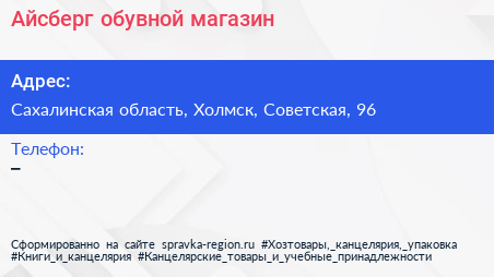 Айсберг, обувной магазин по адресу Сахалинская область, Холмск, Советская, 96 в дальнейшем Организация, размещена в следующих категориях: