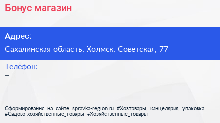 Бонус, магазин по адресу Сахалинская область, Холмск, Советская, 77 в дальнейшем Организация, размещена в следующих категориях: