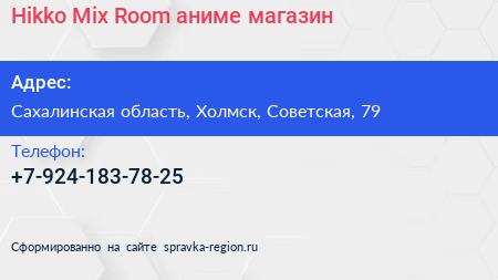 Hikko Mix Room, аниме-магазин по адресу Сахалинская область, Холмск, Советская, 79 в дальнейшем Организация, размещена в следующих категориях:
