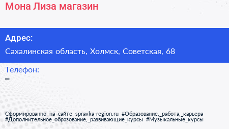 Мона Лиза, магазин по адресу Сахалинская область, Холмск, Советская, 68 в дальнейшем Организация, размещена в следующих категориях: