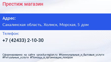 Престиж, магазин по адресу Сахалинская область, Холмск, Морская, 5 дом в дальнейшем Организация, размещена в следующих категориях: